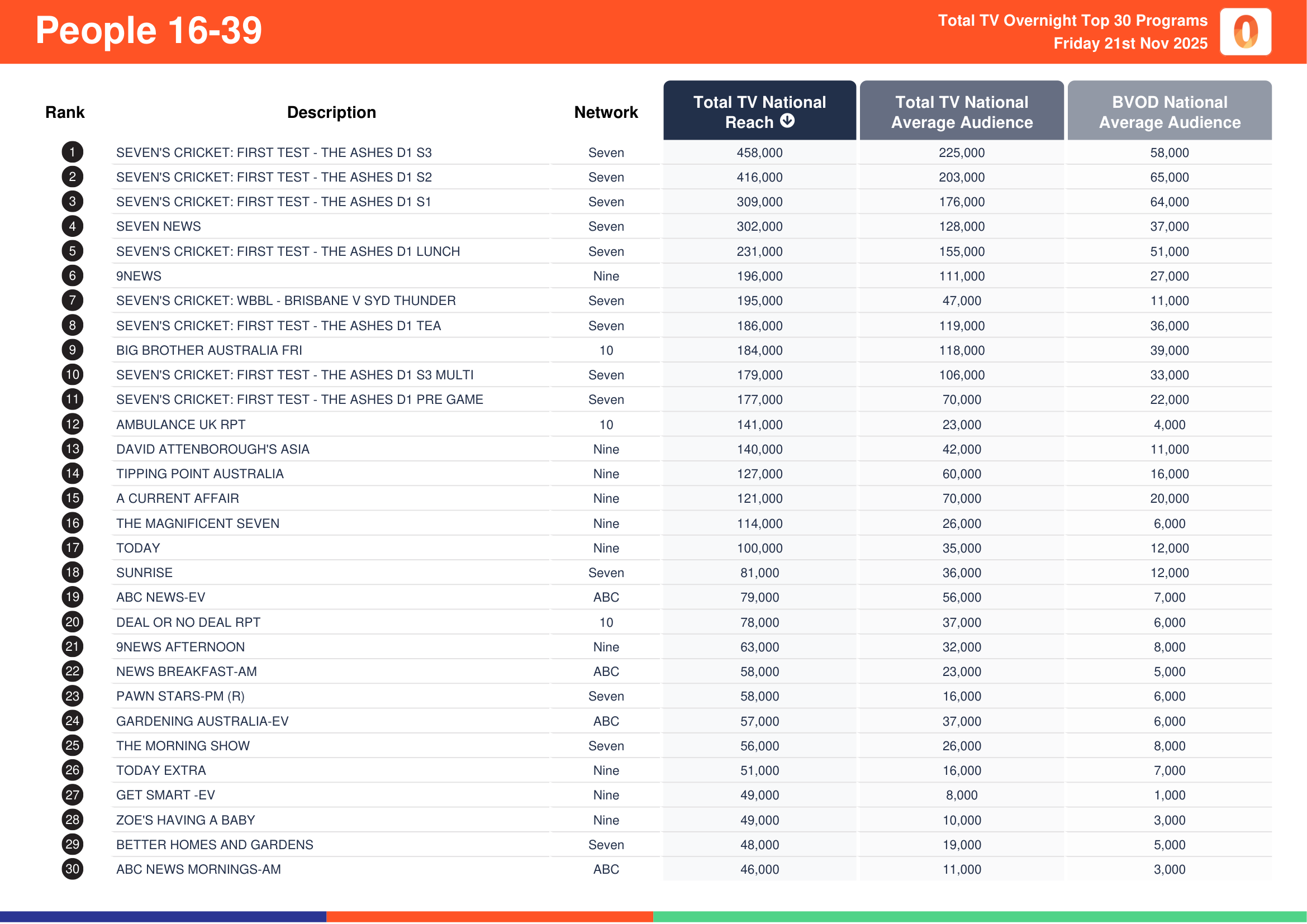 Seven Seven’s Cricket: First Test – The Ashes D1 S1 recorded a total TV national reach of 1,594,000, a total TV national audience of 865,000 and a BVOD audience of 162,000.