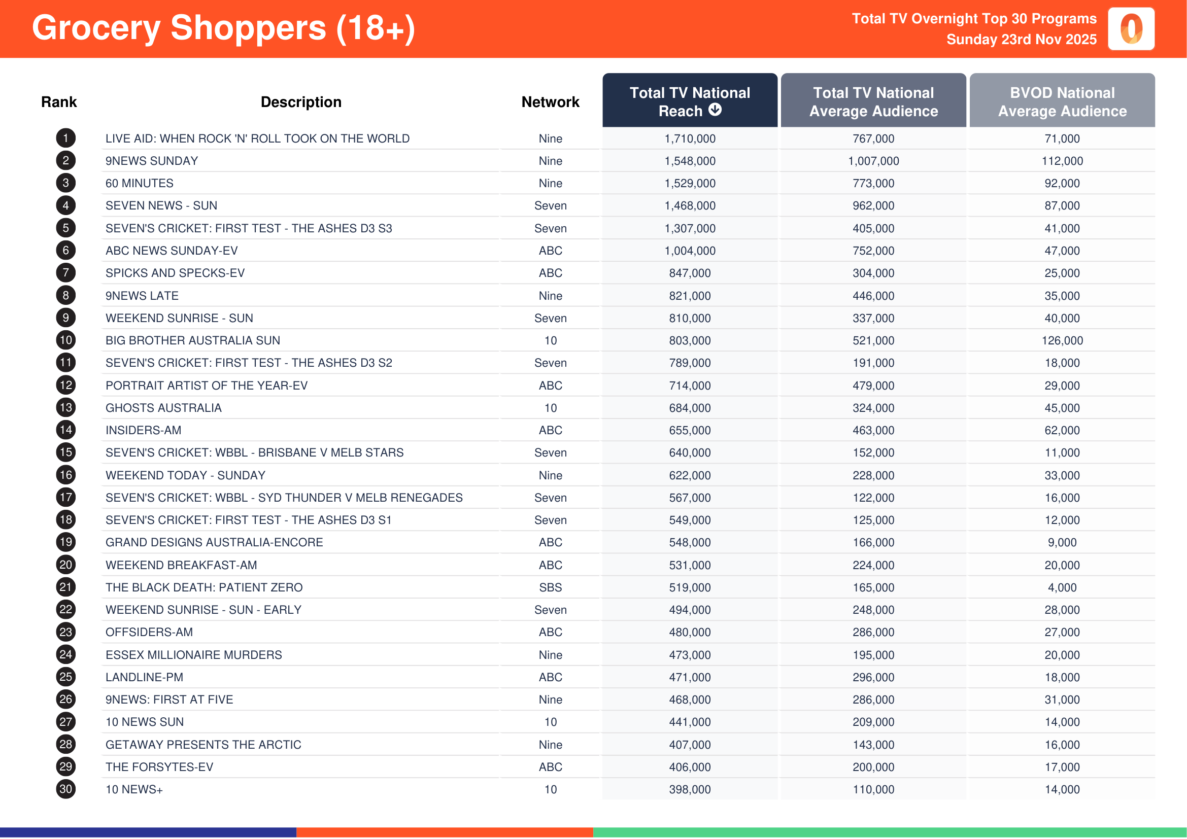 Nine’s Live Aid: When Rock ‘N’ Roll Took On The World recorded a total TV national reach of 2,130,000, a total TV national audience of 933,000 and a BVOD audience of 87,000.