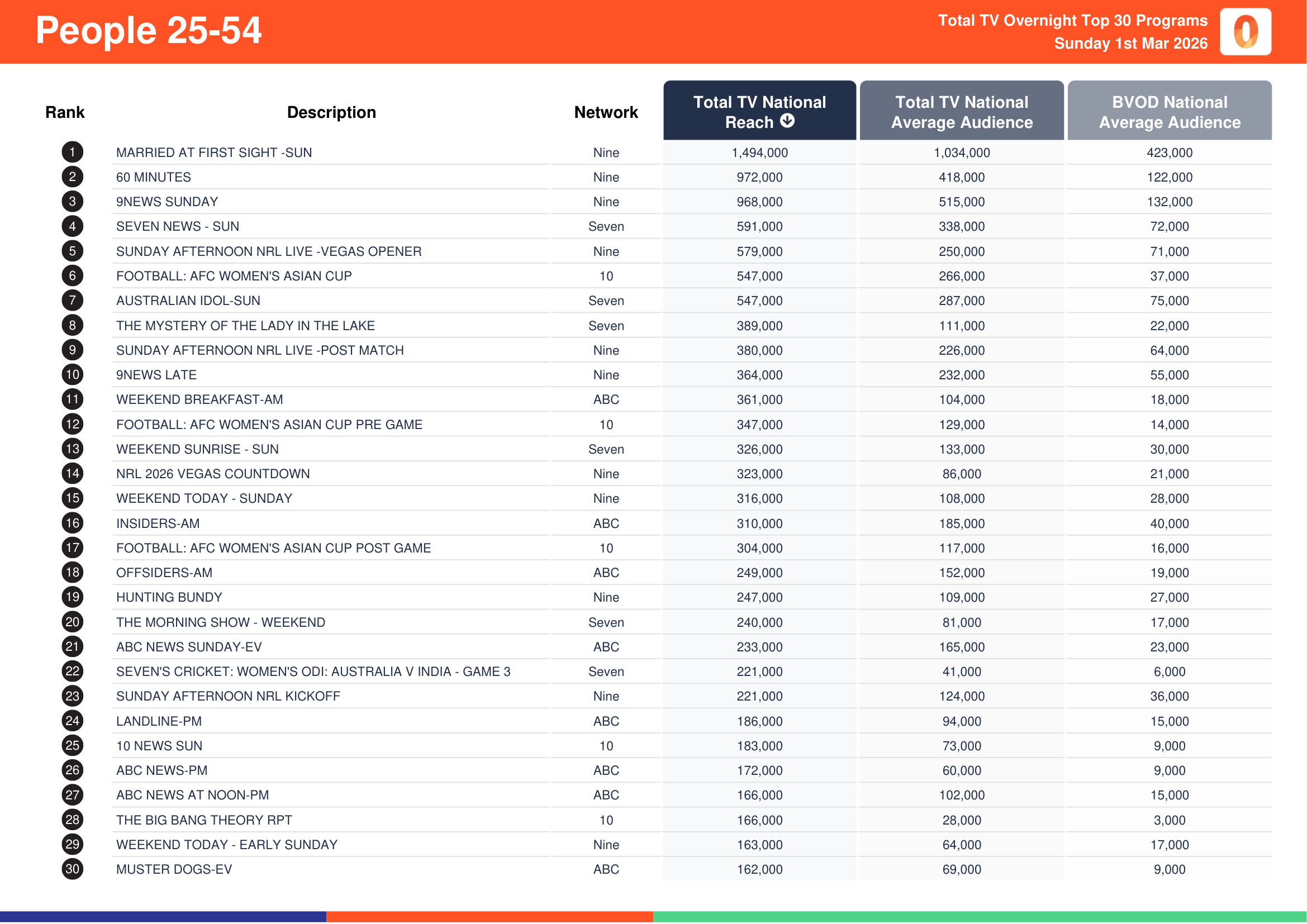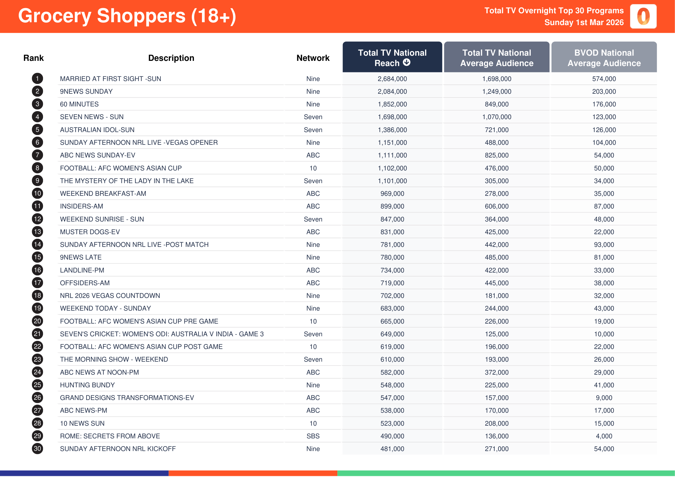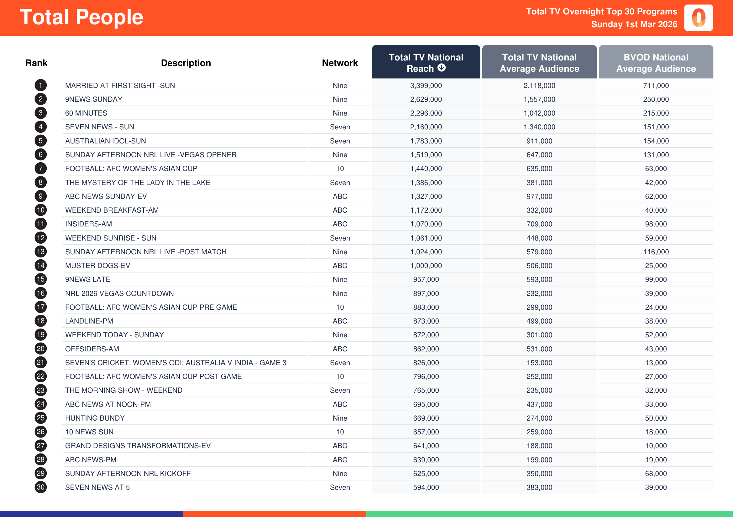 Nine’s Married At First Sight recorded a total TV national reach of 3,399,000, a total TV national audience of 2,118,000 and a BVOD audience of 711,000.