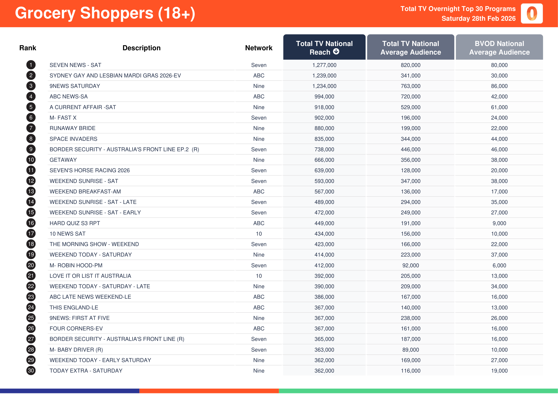 ABC’s Sydney Gay And Lesbian Mardi Gras 2026-Ev recorded a total TV national reach of 1,515,000, a total TV national audience of 409,000 and a BVOD audience of 35,000.