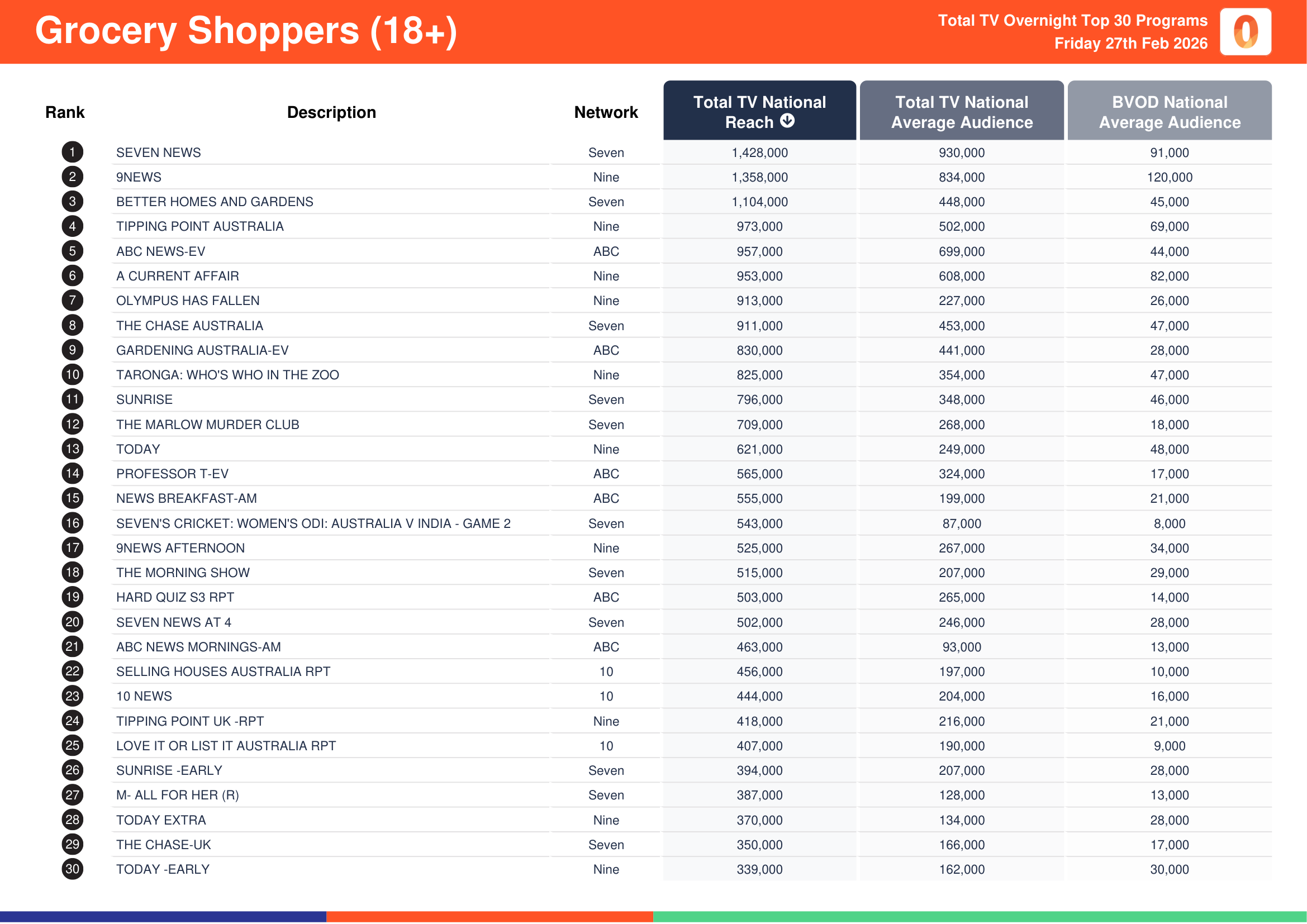 Seven’s Seven News recorded a total TV national reach of 1,767,000, a total TV national audience of 1,145,000 and a BVOD audience of 111,000.