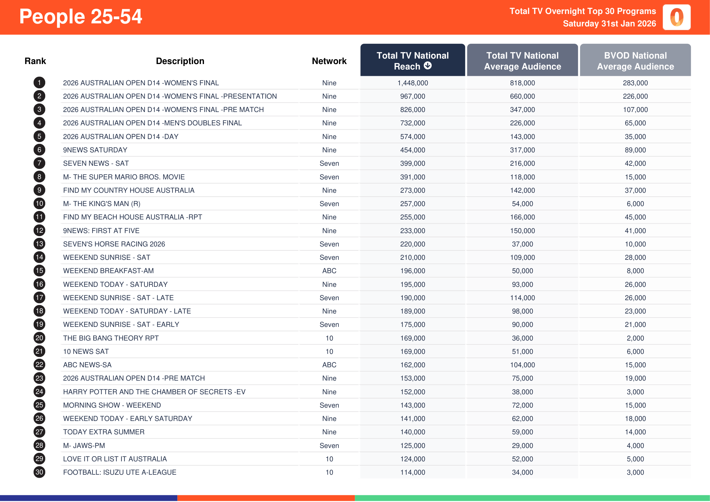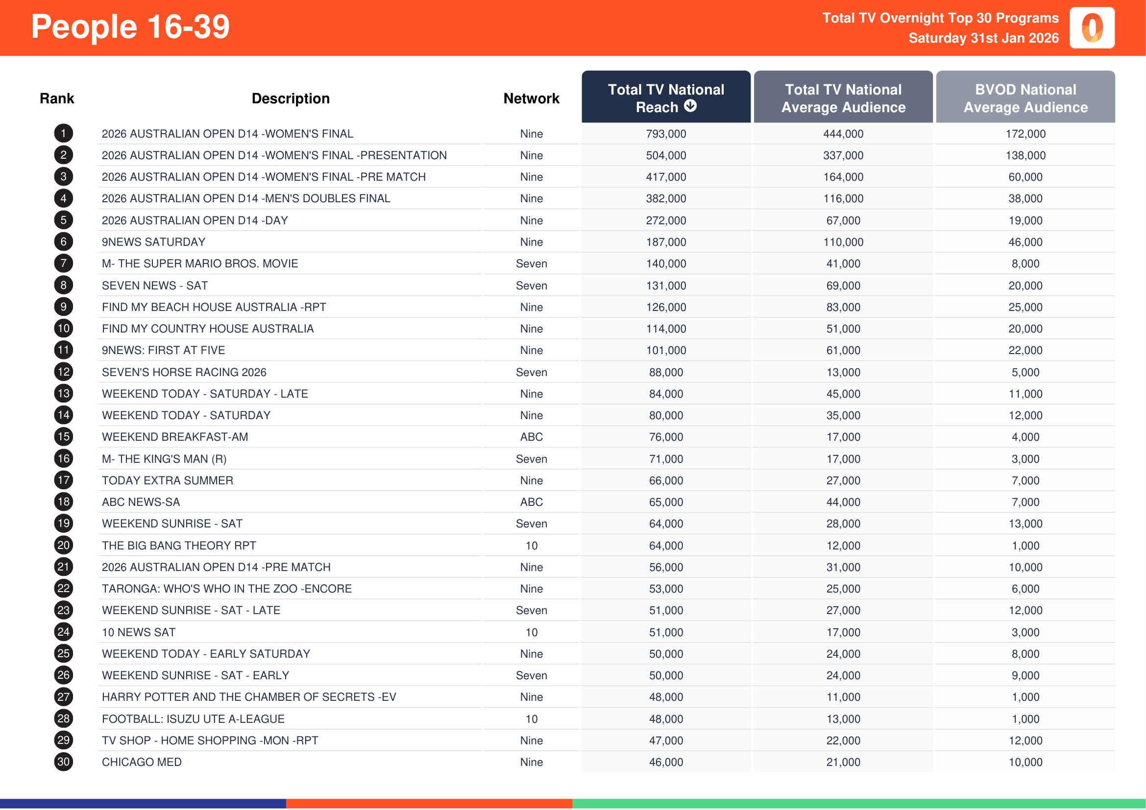Nine’s 2026 Australian Open D14 -Women’s Final -Presentation recorded a total TV national reach of 2,603,000, a total TV national audience of 1,789,000 and a BVOD audience of 396,000.