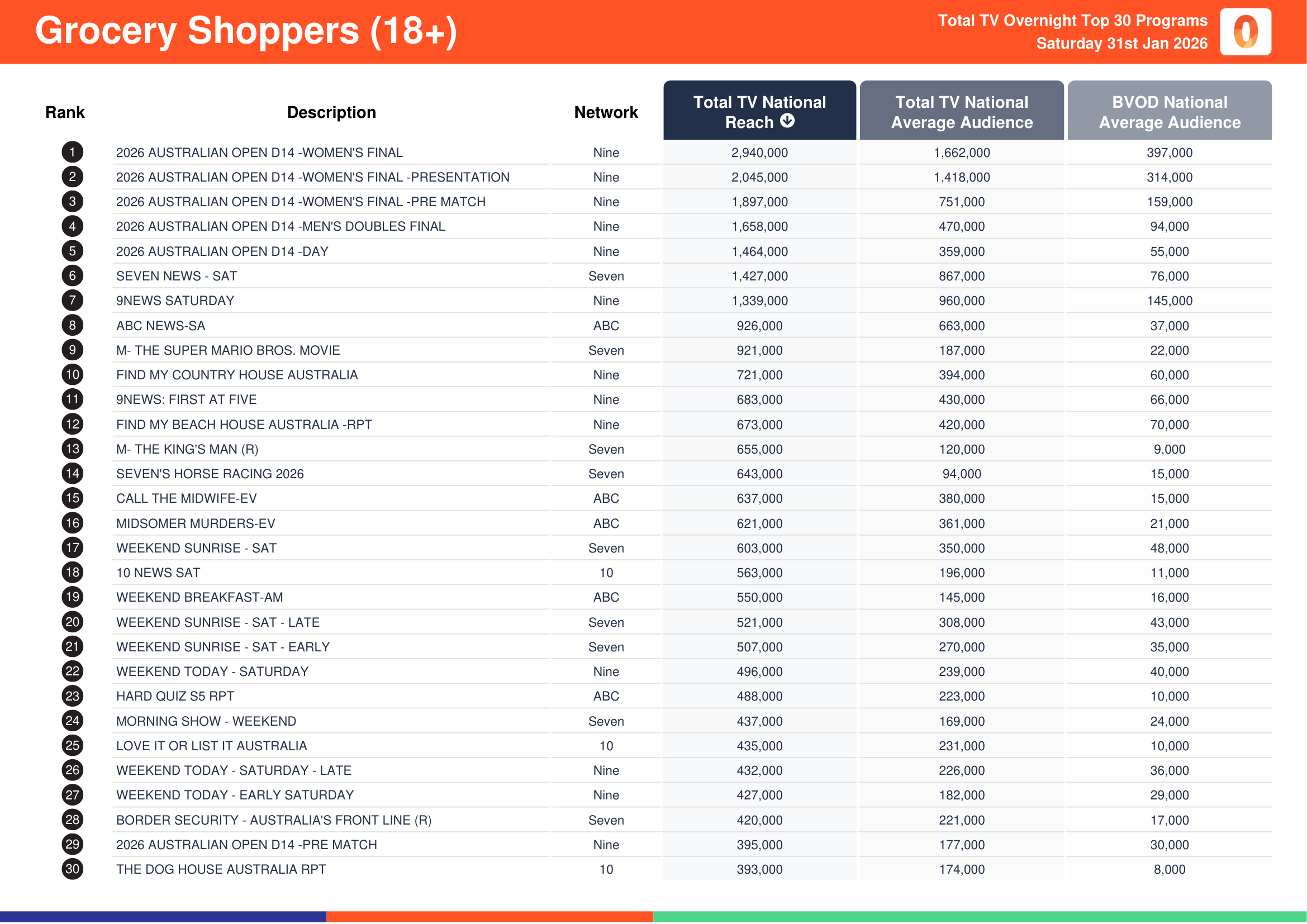 Nine’s 2026 Australian Open D14 -Women’s Final -Pre Match recorded a total TV national reach of 2,437,000, a total TV national audience of 947,000 and a BVOD audience of 199,000.