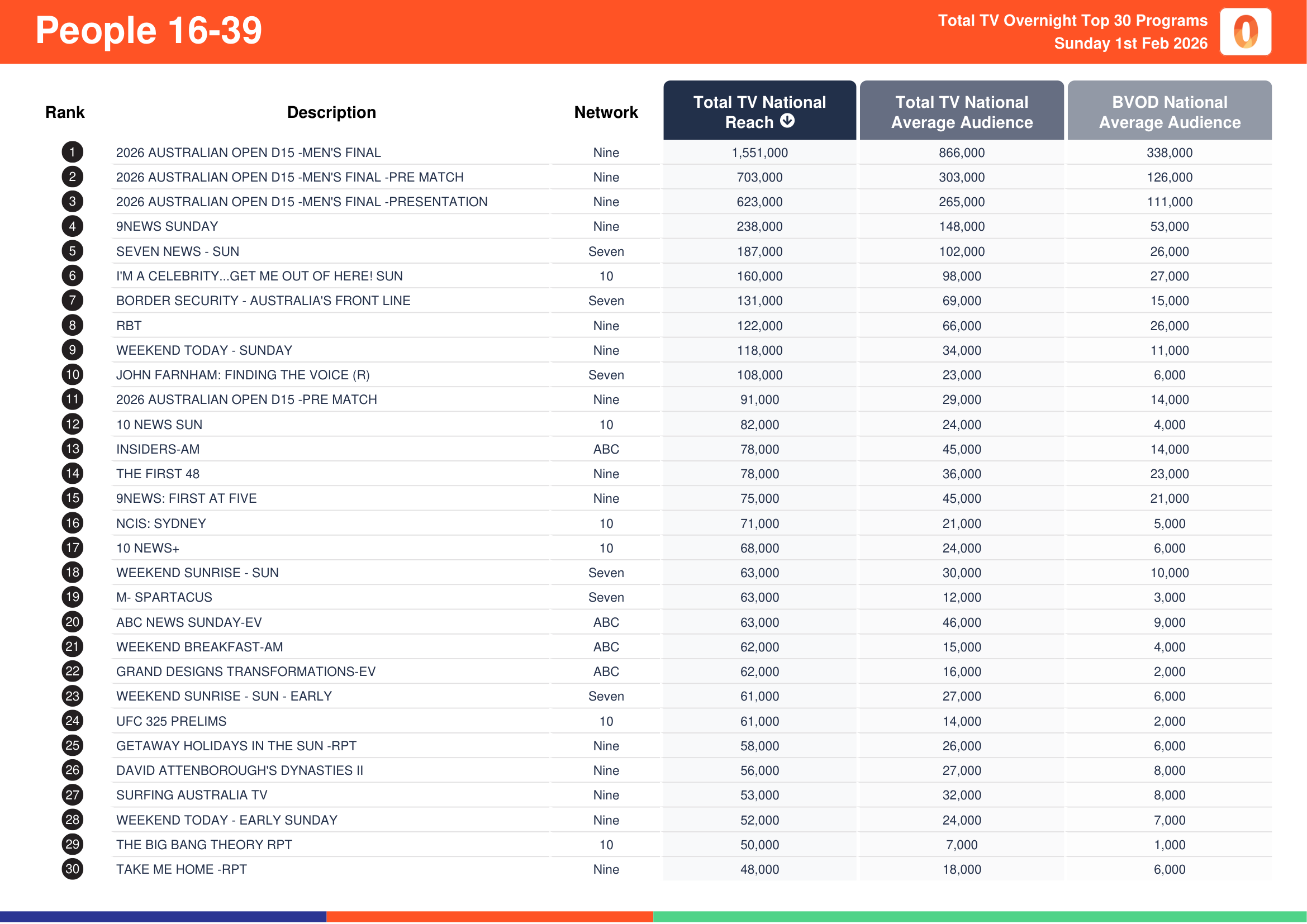 Nine’s 2026 Australian Open D15 -Men’s Final recorded a total TV national reach of 6,302,000, a total TV national audience of 3,448,000 and a BVOD audience of 905,000.