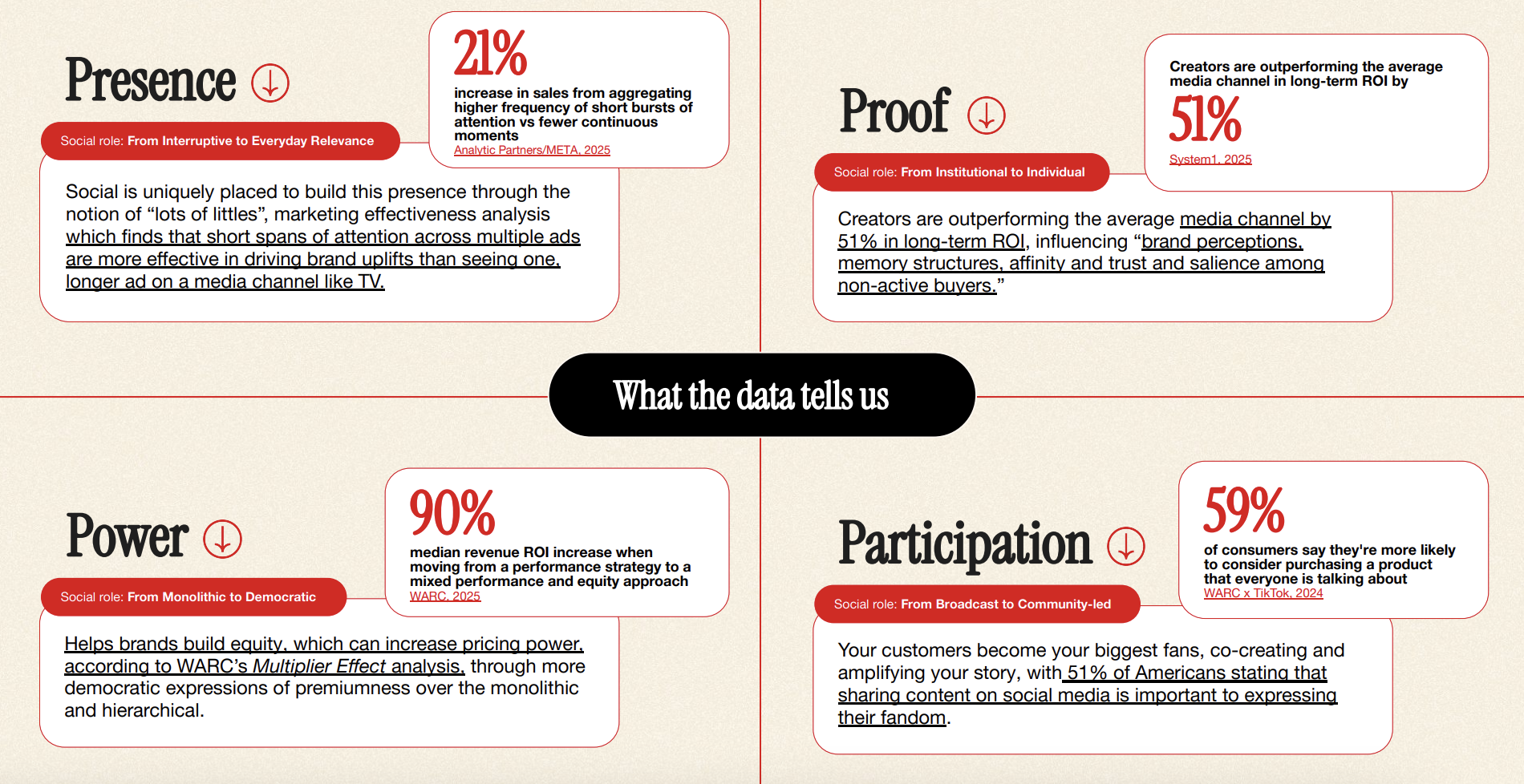 Even so, marketers are doubling down. Social has overtaken TV, print and every other channel as the most powerful driver of emotional connection and cultural impact – and it’s fast becoming a commerce engine too, with 63% already selling directly via social and another 17% planning to jump in this year.