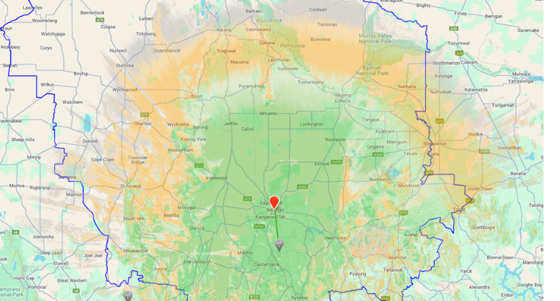 The blue border indicates Bendigo television area. The grey pinpoint is the transmission site. The areas without television transmission are the highlighted green, orange, and grey-shaded areas, which receive TV signals from the grey pinpoint.