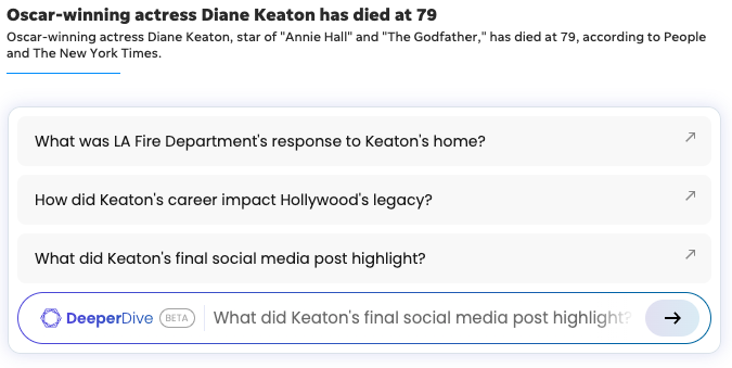 Mediaweek was especially impressed by the ‘Search AI’ integration into US news website USA Today. It uses DeeperDive AI, a platform built by the team at Taboola and can be used by readers to get deeper insights on news stories and to use the existing USA Today archive to drive deeper understanding of today’s news. It’s a great example of mining value out of work that previously had limited attention in a deep archive of data.